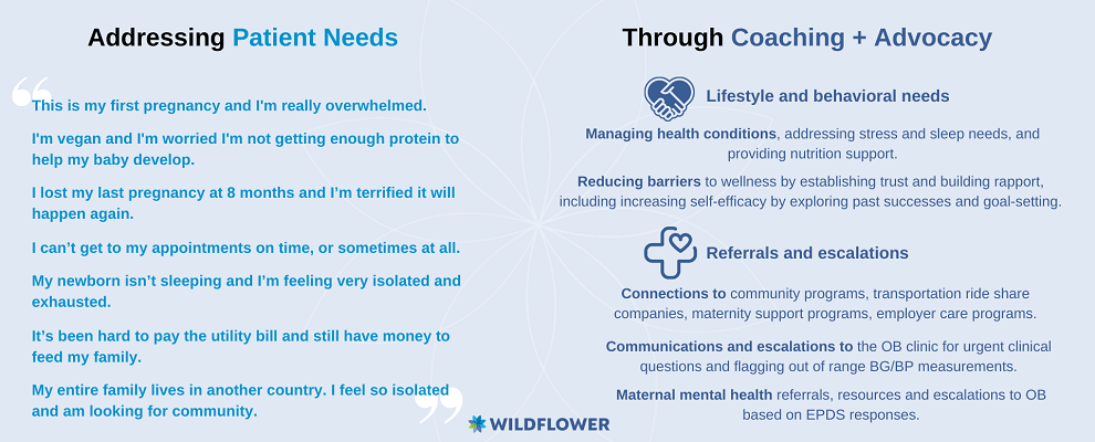 In creating an environment based on trust, a key part of the coaching relationship is addressing the patient’s current life situation, and what resources their care team can provide. Enter Maslow’s Hierarchy of Needs. Did the patient disclose that they can’t keep food on the table? Let’s explore why and see what the coach can do, such as referring the patient to case management or leaning on a Wildflower Health Advocate’s expertise in resources and local support programs. It is crucial that the coach maintain the boundaries of their profession, and this highlights the importance of relationships with other care providers. We can’t talk about coaching within the medical landscape without mentioning the very special symbiosis between a patient’s Health Coach, Health Advocate, and their OB, which is key to the care coordination model powered by Wildflower.